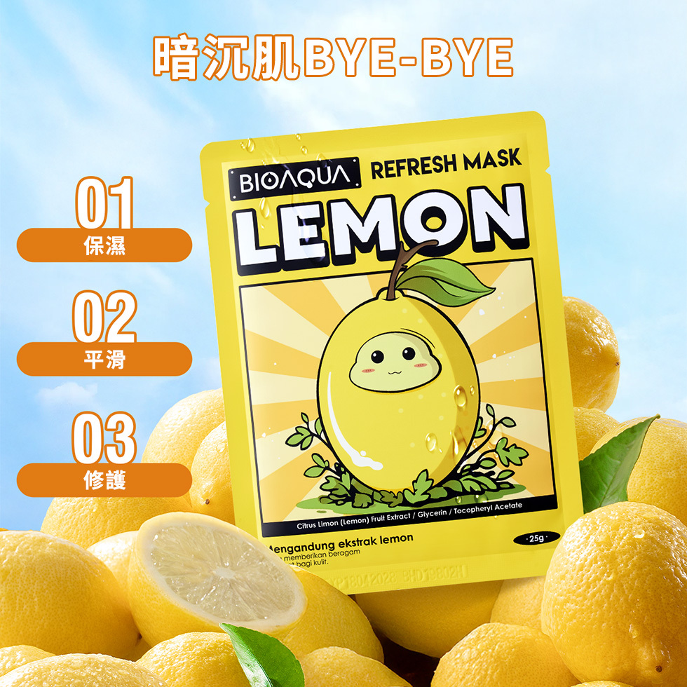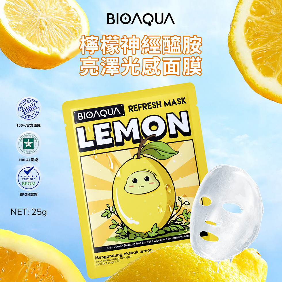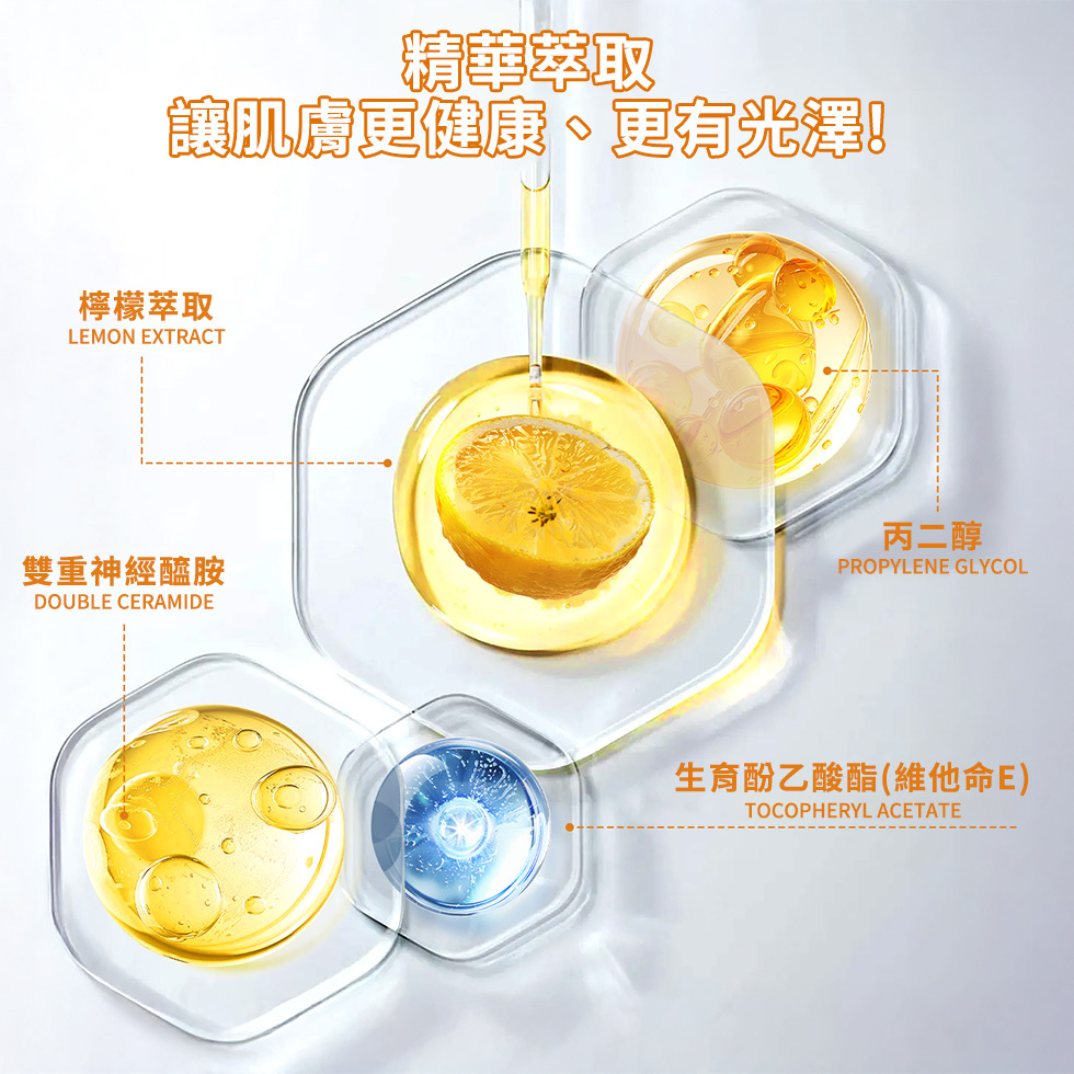 【檸檬神經醯胺亮澤光感面膜】含檸檬萃取、雙重神經醯胺,強化肌膚屏障,幫助肌膚恢復自然光澤,適合暗沉肌膚。親膚透氣面膜布,360°貼合臉部肌膚,幫助精華滲透肌底。