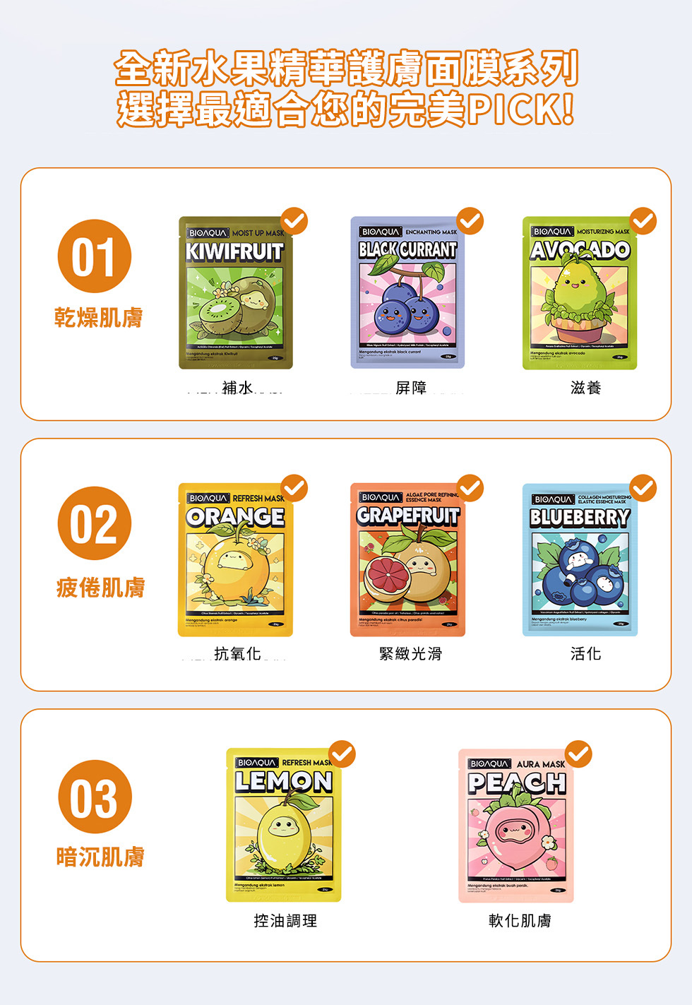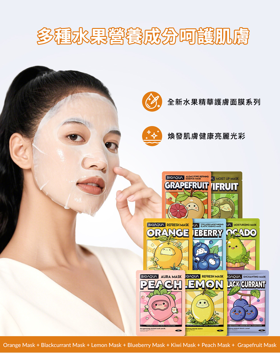 商品:BIOAQUA|檸檬神經醯胺亮澤光感面膜*5+酪梨彈潤滋養柔嫩面膜*5+葡萄柚毛孔緊緻光滑面膜*5+水蜜桃萌顏晶透亮膚面膜*5