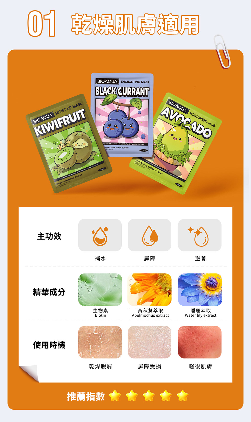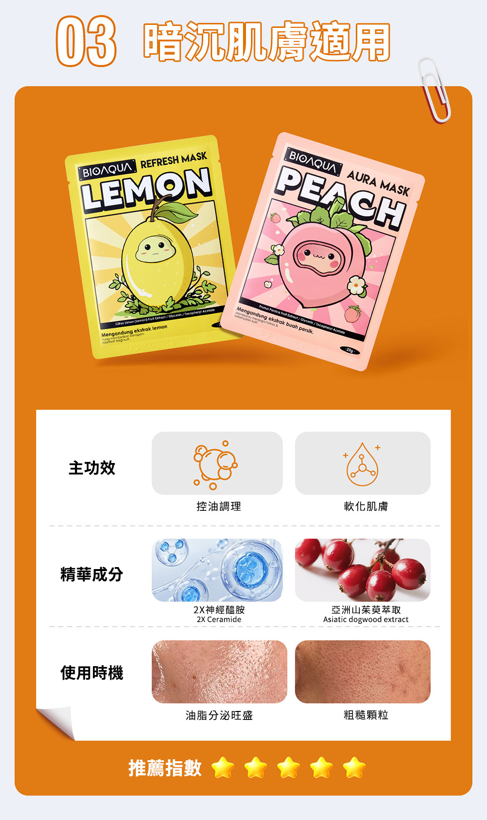 【水蜜桃萌顏晶透亮膚面膜】含水蜜桃萃取、山茱萸萃取,有助提亮暗沉膚色,改善粗糙顆粒,使肌膚柔潤透亮,適合暗沉粗糙肌膚。親膚透氣面膜布,360°貼合臉部肌膚,幫助精華滲透肌底。