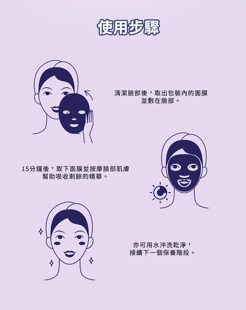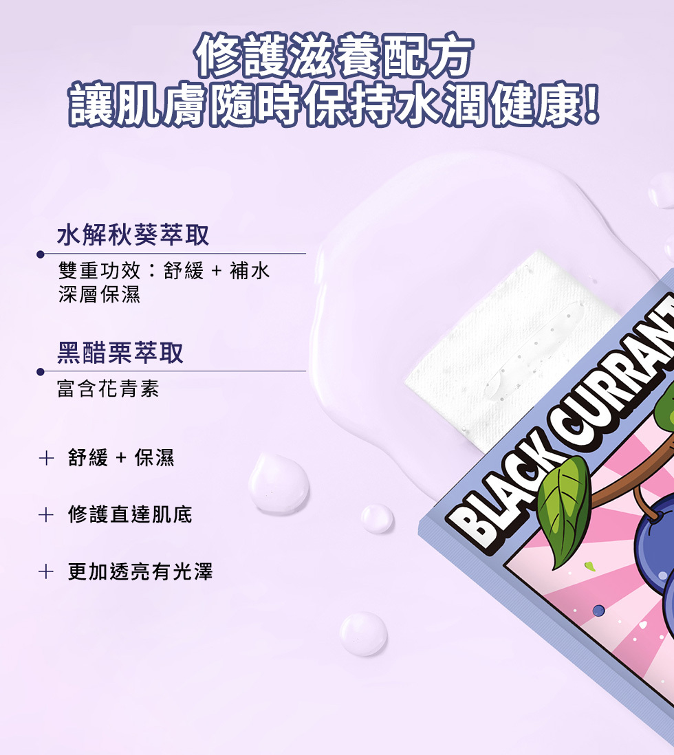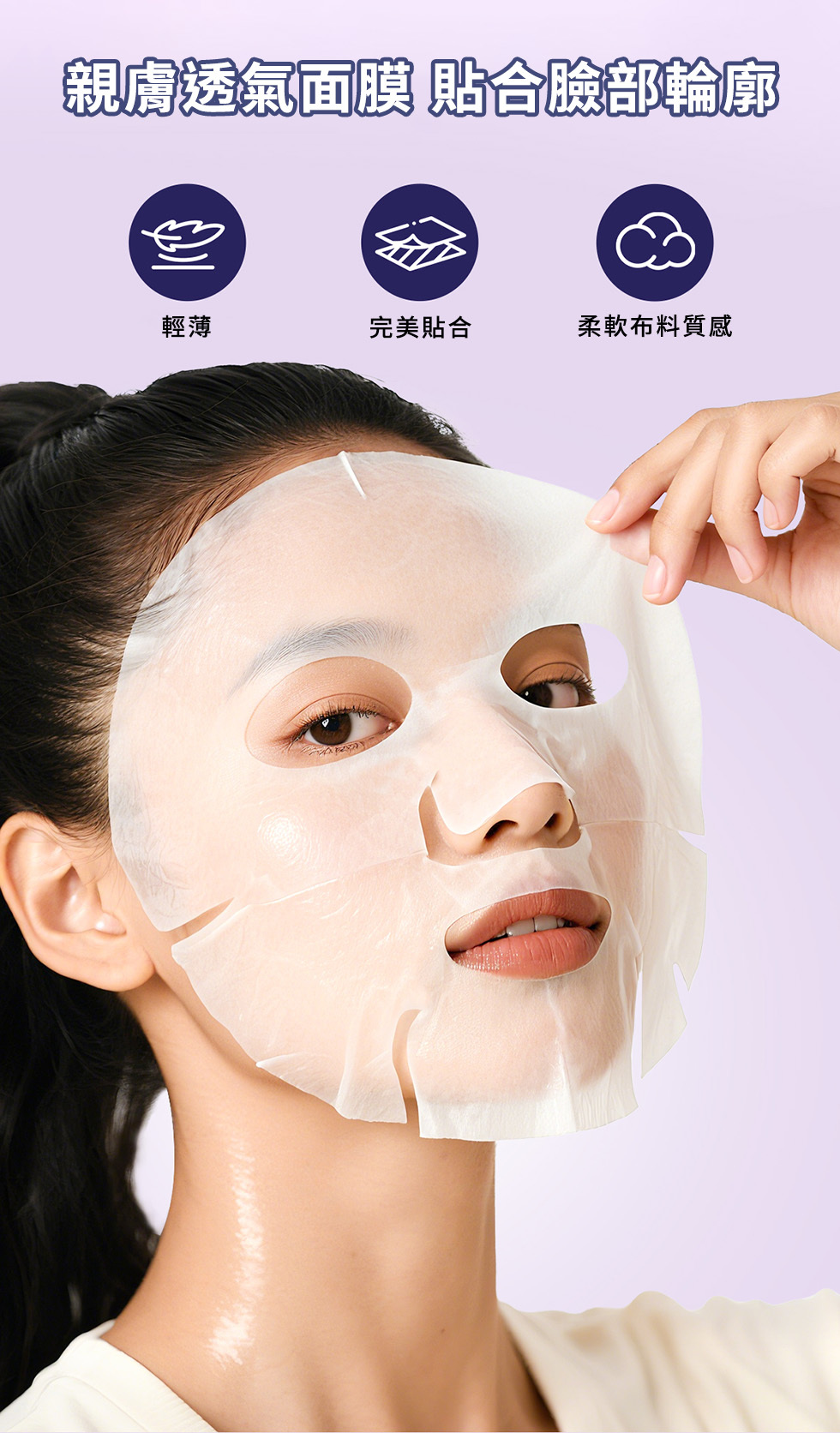 含黑醋栗果萃取、水解秋葵萃取,水解牛奶蛋白,溫和修護肌膚屏障,舒緩肌膚同時更柔軟光滑,適合屏障問題肌膚。親膚透氣面膜布,360°貼合臉部肌膚,幫助精華滲透肌底。