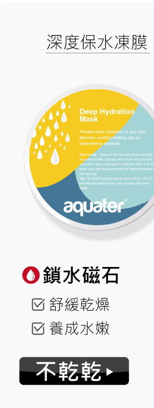 aqauter推出全新三款智慧水感凍膜,添加專櫃級保濕成分醣基海藻糖,清爽無油保養。強力高壓特性,緊緊封鎖水分在每一吋肌膚以及角度,兩用型可依照每日肌膚需求可厚敷或是一般保養。讓你每天都忍不住照鏡子,愛上自己的高光美肌。