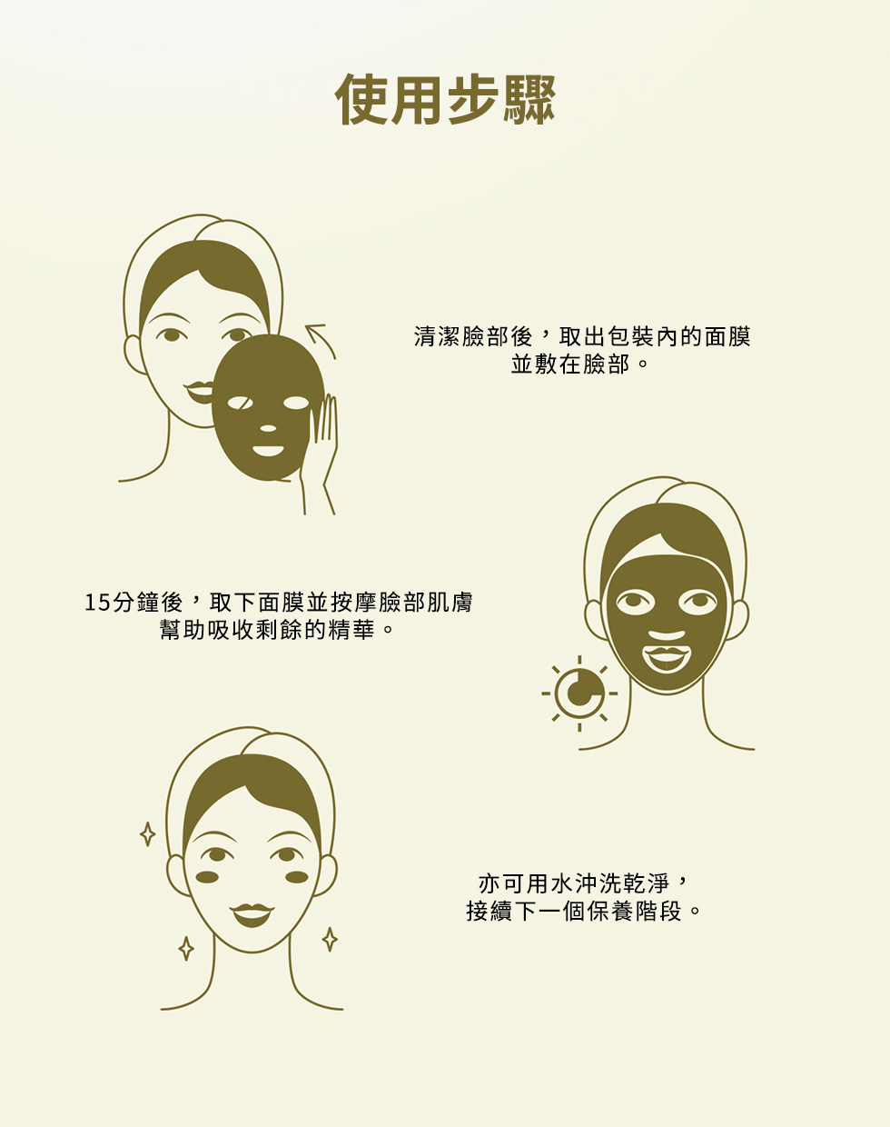 洗臉後,將面膜敷在臉上,輕輕按壓擠掉氣泡,使面膜和臉部肌膚緊密貼合,等待10-15分鐘,取下面膜,用袋中剩餘的面膜精華液按摩臉部直至吸收。 |