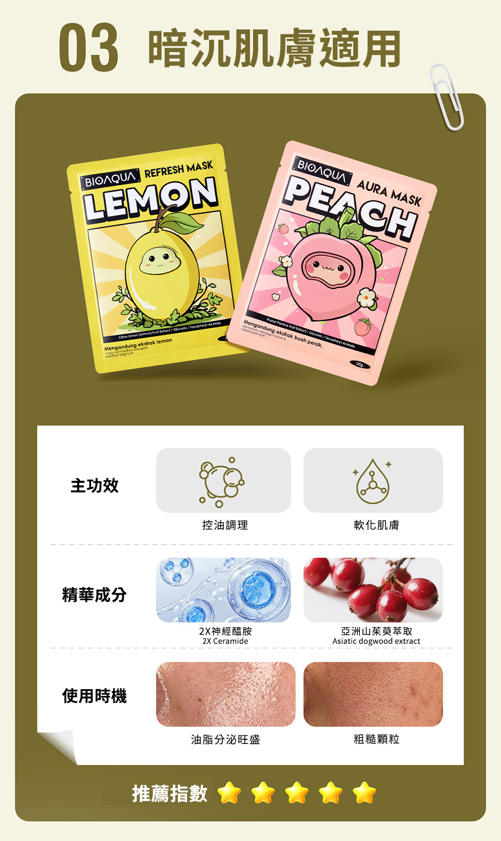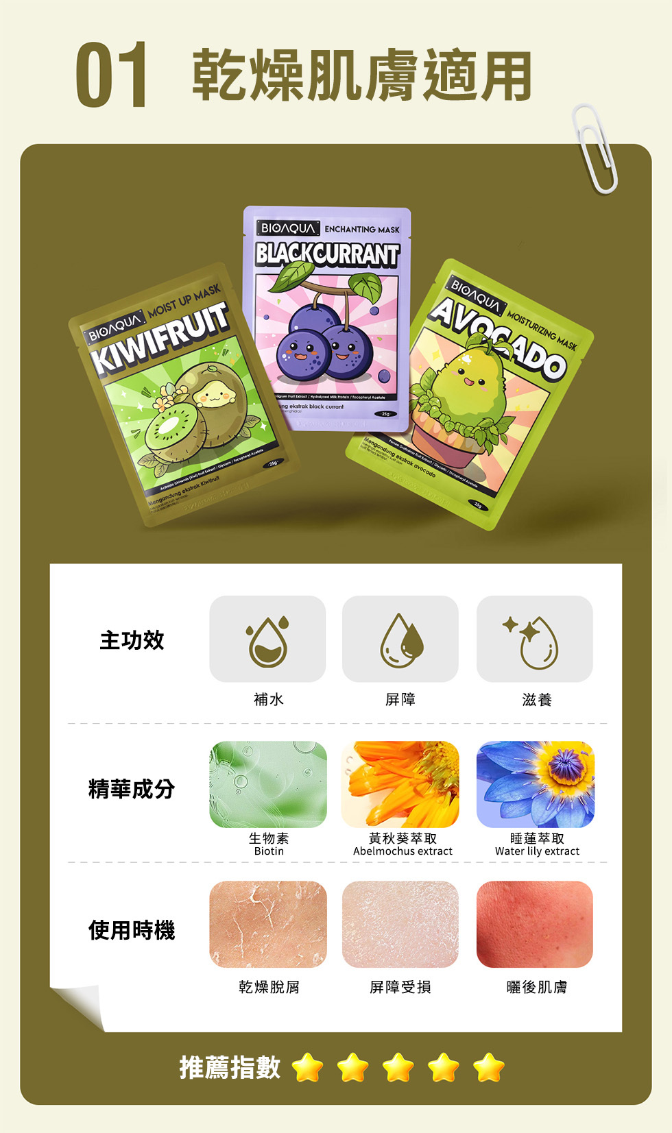 含奇異果萃取、維他命E、生物素,潤澤肌膚同時鎖住水分,讓肌膚光滑、柔軟,適合乾燥肌膚。親膚透氣面膜布,360°貼合臉部肌膚,幫助精華滲透肌底。