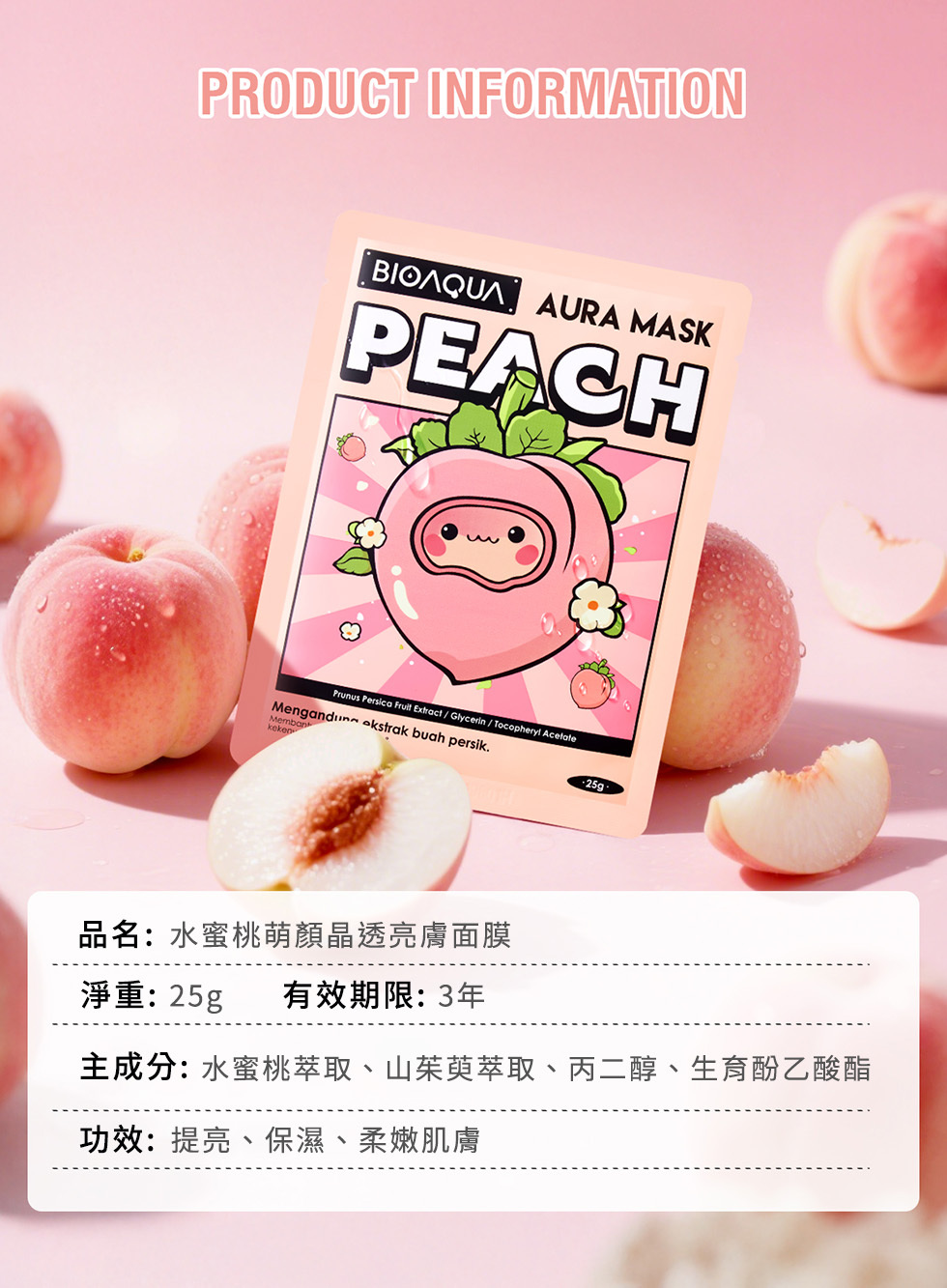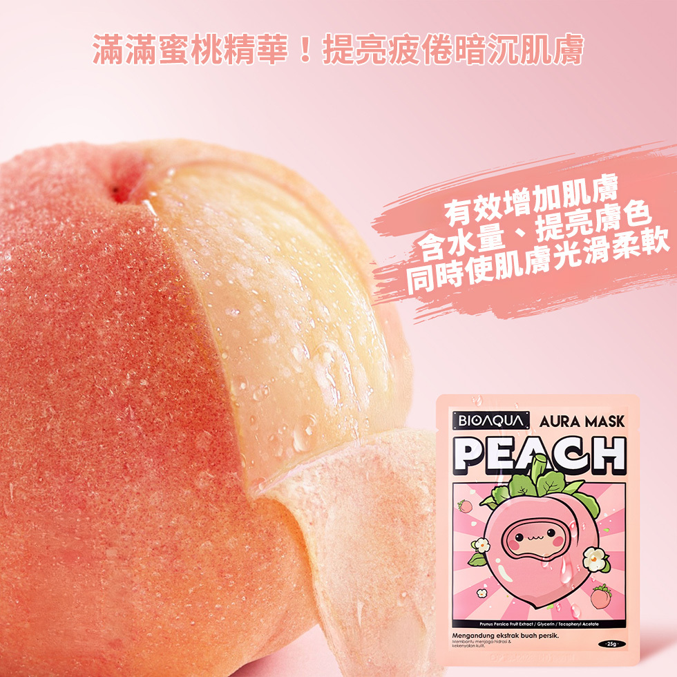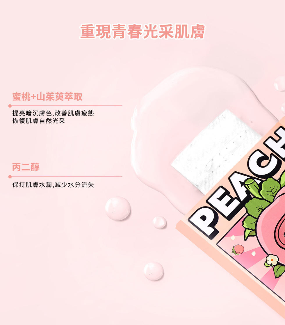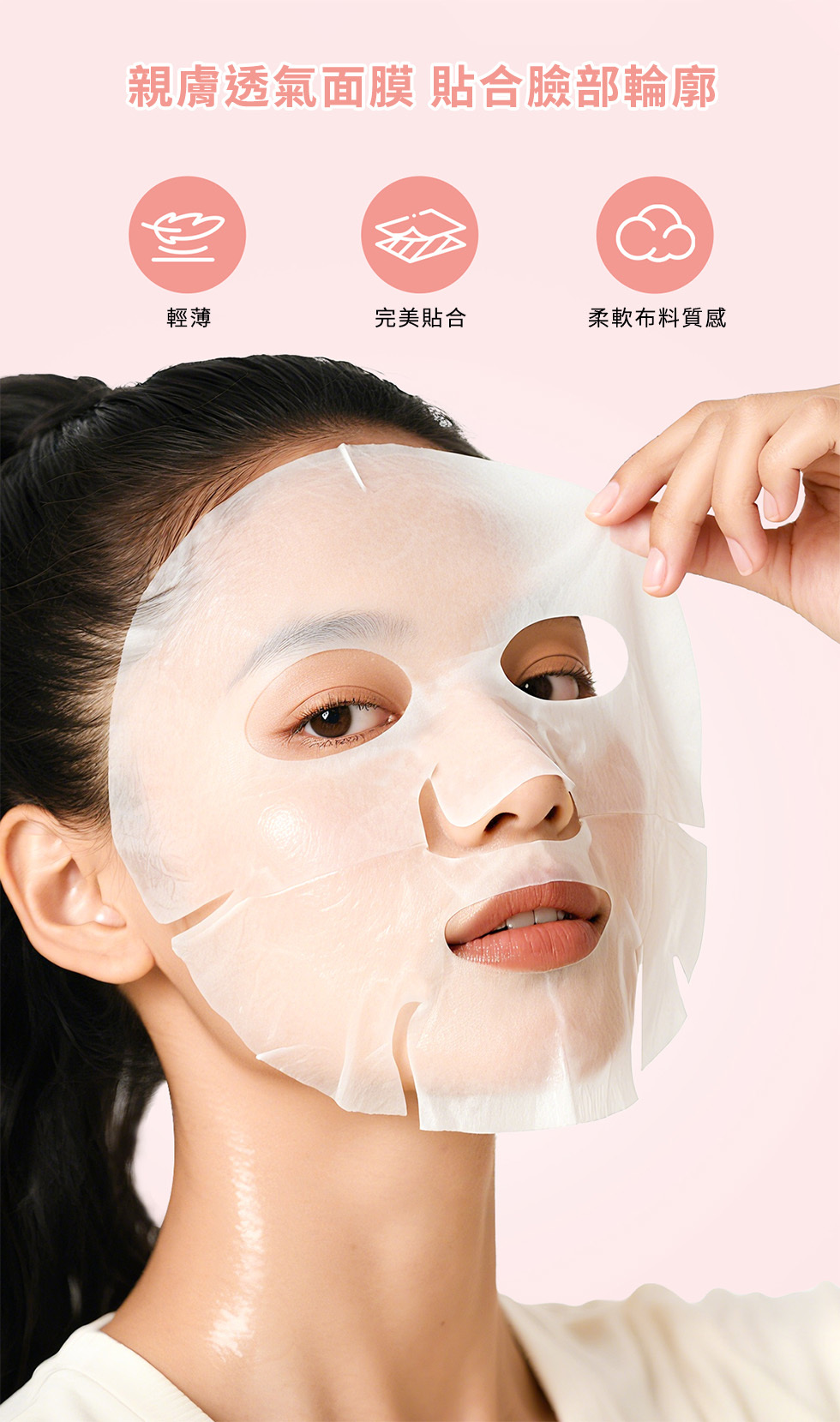 含水蜜桃萃取、山茱萸萃取,有助提亮暗沉膚色,改善粗糙顆粒,使肌膚柔潤透亮,適合暗沉粗糙肌膚。親膚透氣面膜布,360°貼合臉部肌膚,幫助精華滲透肌底。