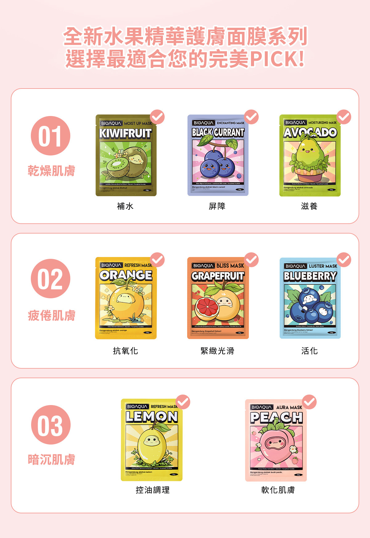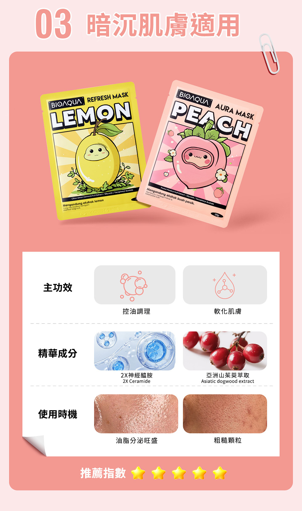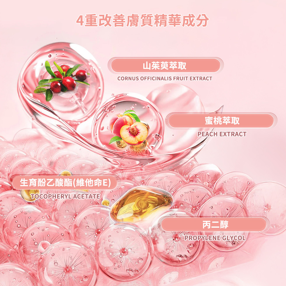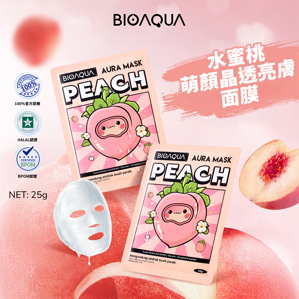 含水蜜桃萃取、山茱萸萃取,有助提亮暗沉膚色,改善粗糙顆粒,使肌膚柔潤透亮,適合暗沉粗糙肌膚。親膚透氣面膜布,360°貼合臉部肌膚,幫助精華滲透肌底。