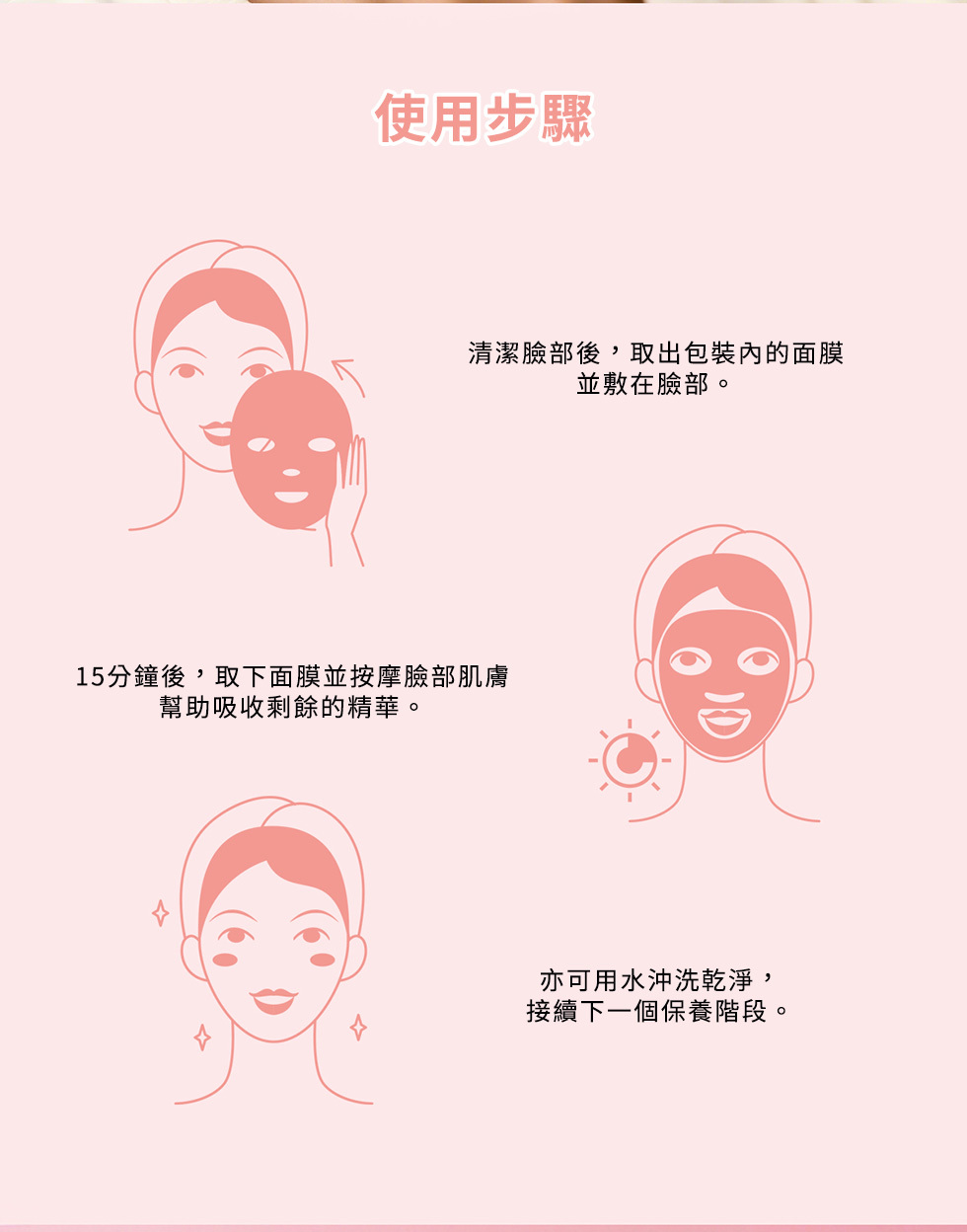 洗臉後,將面膜敷在臉上,輕輕按壓擠掉氣泡,使面膜和臉部肌膚緊密貼合,等待10-15分鐘,取下面膜,用袋中剩餘的面膜精華液按摩臉部直至吸收。 |