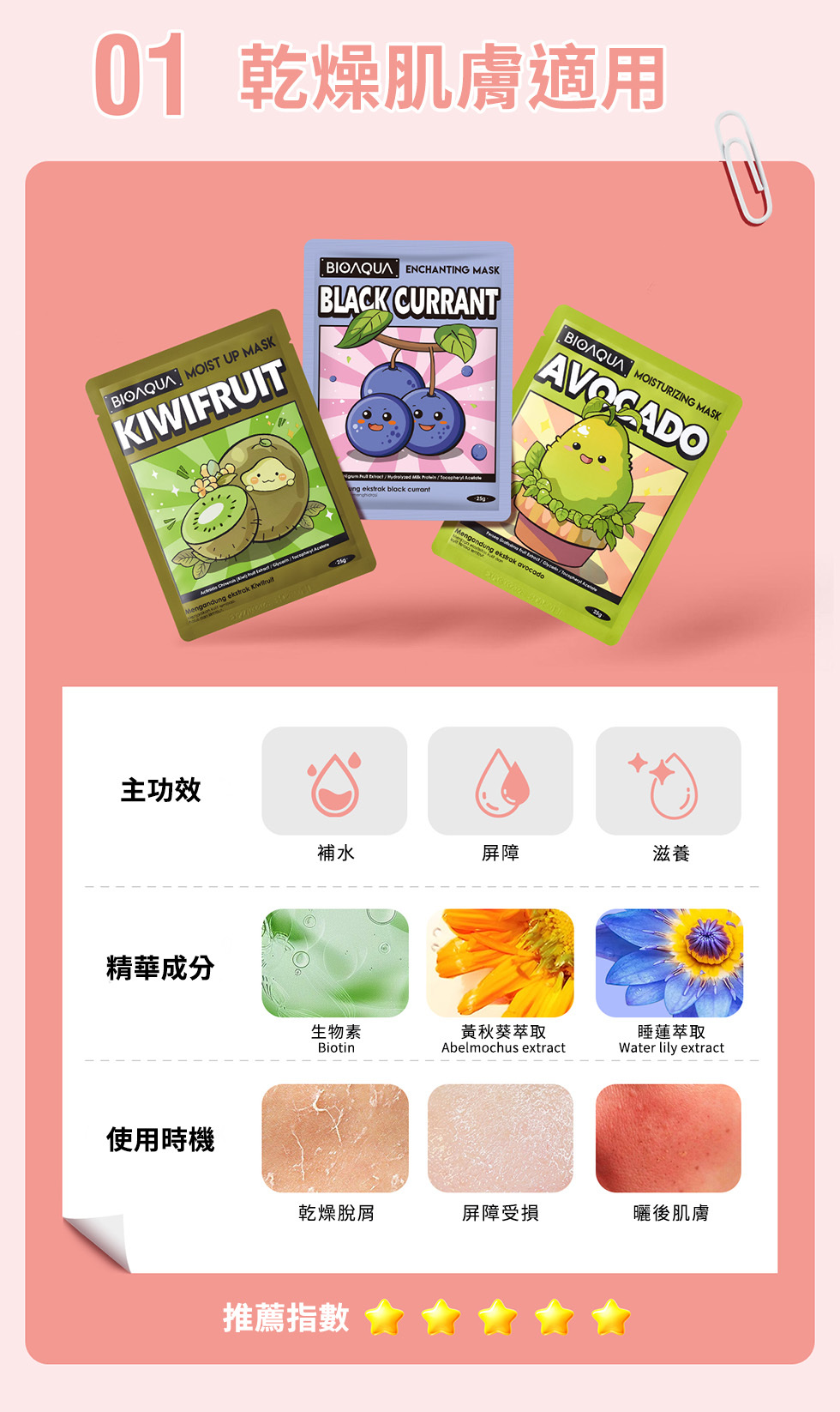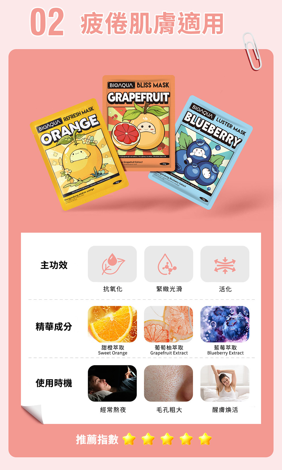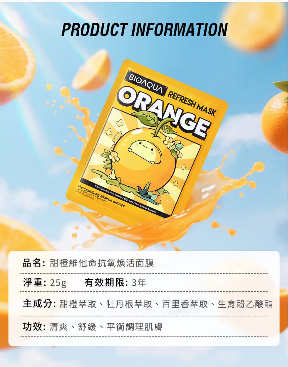 含甜橙、牡丹根、百里香萃取,幫助肌膚調理油水平衡,強化並穩定膚況,適合疲倦肌膚。親膚透氣面膜布,360°貼合臉部肌膚,幫助精華滲透肌底。
