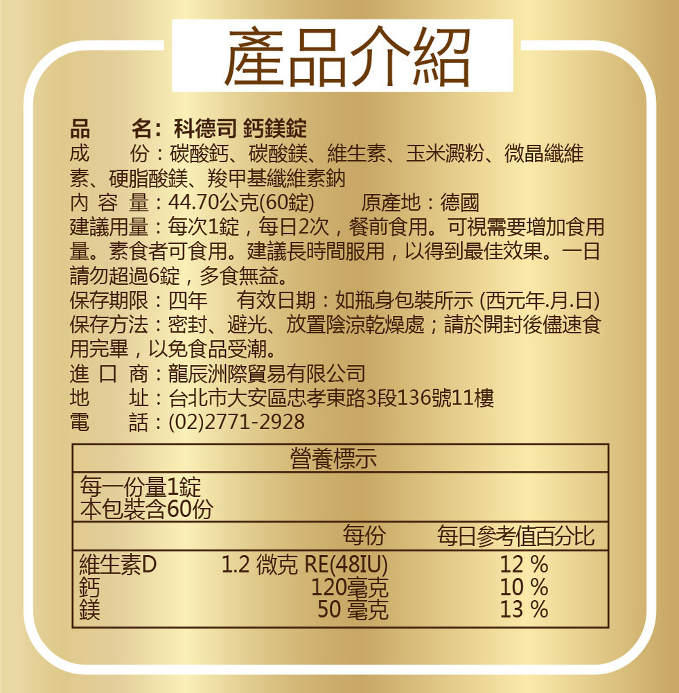 商品:鈣鎂錠(60粒/瓶) 德國原裝保健食品