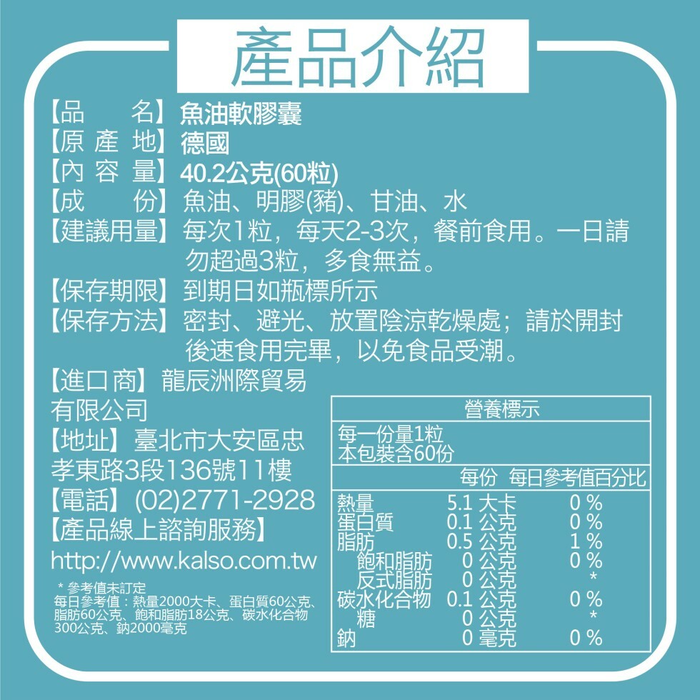 商品:魚油軟膠囊(60粒/瓶) 德國原裝保健食品