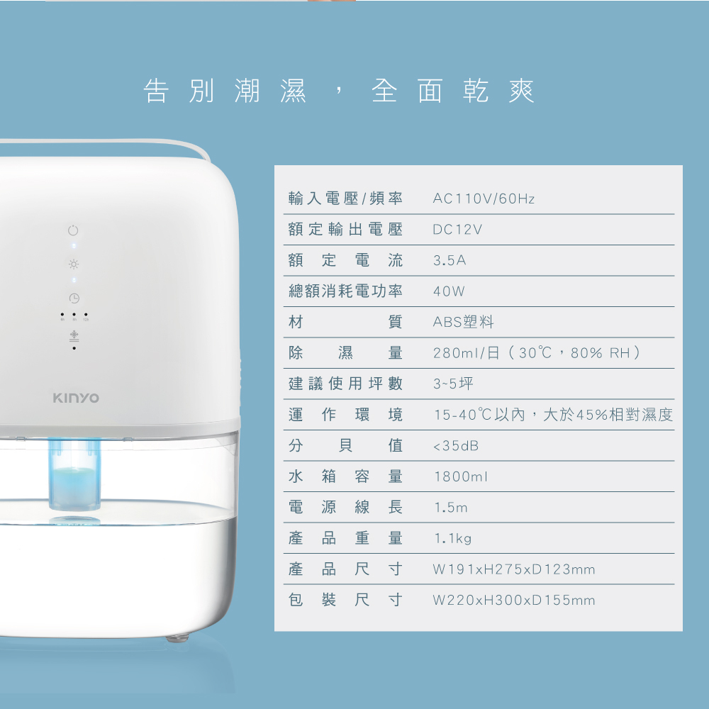 適用於3~5坪,除濕量280ml/日,打造乾爽舒適空間