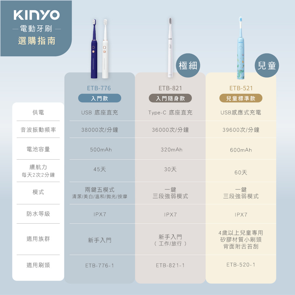 額定電壓:DC 5V 消耗功率:1.8W 震動頻率:38000次/分±2000次 使用電源:DC 5V 1A 電池規格/容量:內建鋰電池 500mAh 充電時間:約2-4小時 使用時間:約45天 (以每天2次,每次2分鐘計算) 防水等級:IPX7 材質:ABS塑膠 +杜邦刷毛 產品重量:84g ±5%(含刷頭) 產品尺寸:Φ25XH235mm(含刷頭) 包裝尺寸:W120XH230XD40mm 配件:刷頭x2,充電線X1 ※刷頭建議定期更換,如需購買請選購適用型號ETB-776-1 |