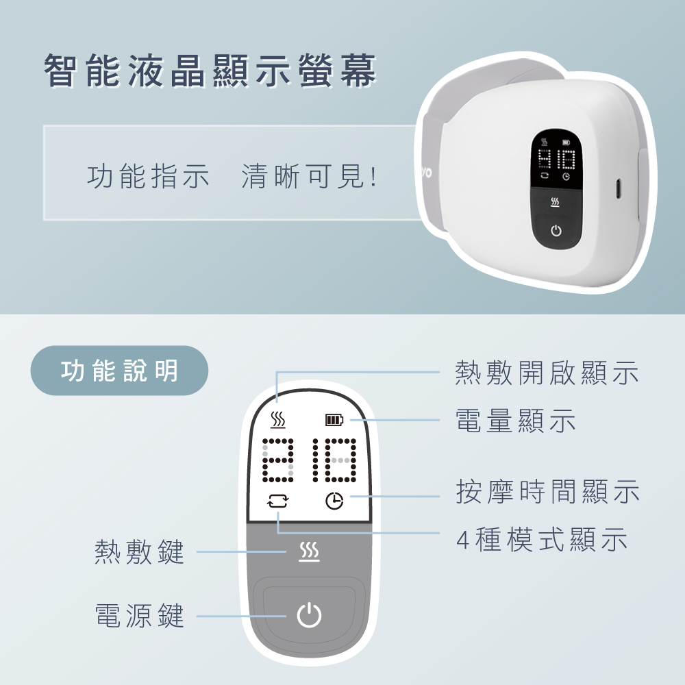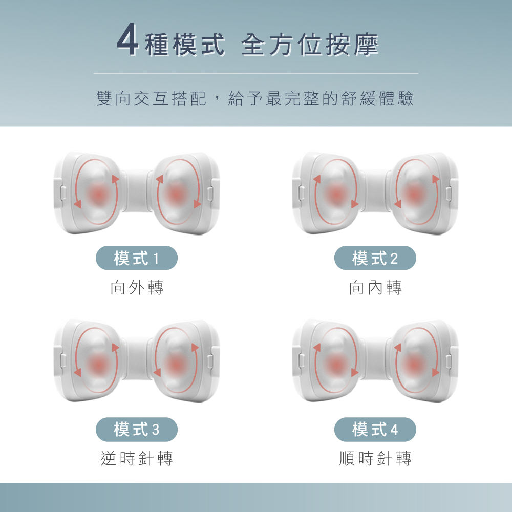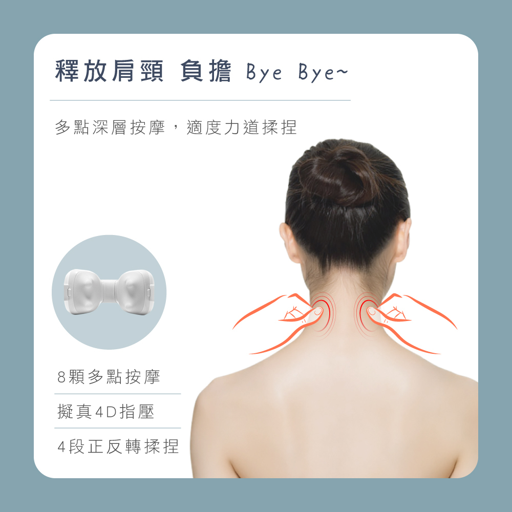 | 產品特色 | .擬真4D指壓,8顆多點按摩 .深度穴位揉捏,熱敷舒緩放鬆 .無線輕巧便利,雙鍵簡易操作 |