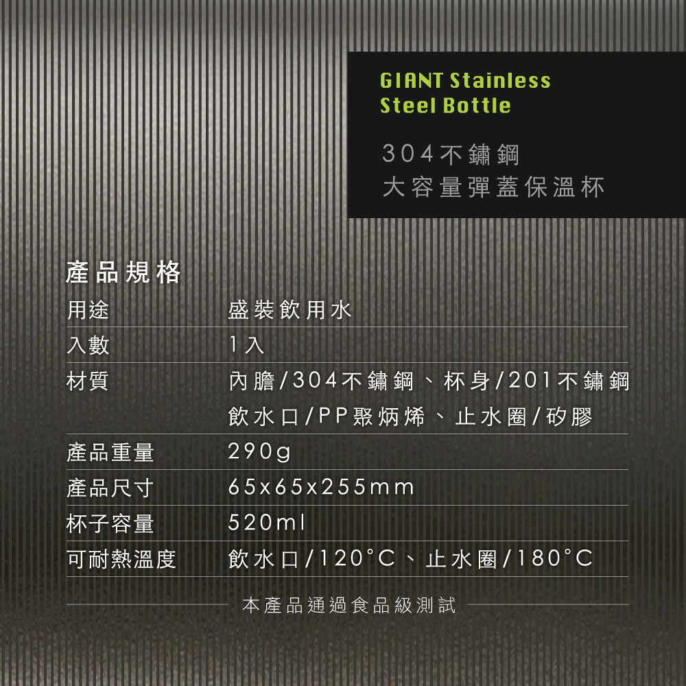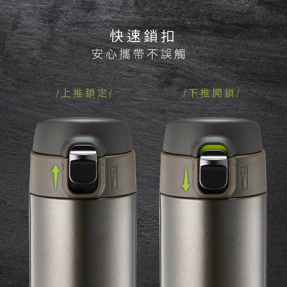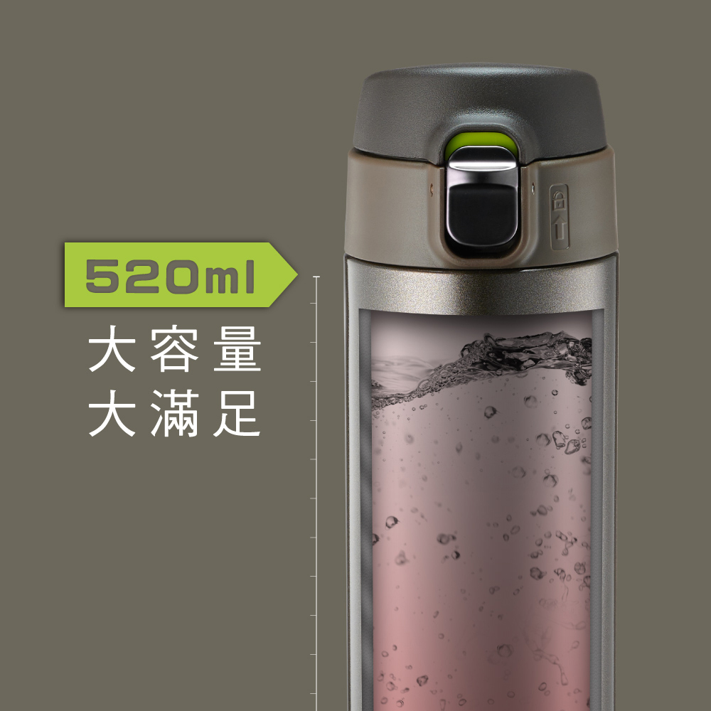 | 產品規格 | .520ml大容量大滿足 .5公分大口徑,可加冰塊好清洗 .彈跳蓋設計,可單手操作,一鍵開蓋 .上推鎖定/下推開鎖,快速鎖扣設計,避免誤觸開蓋 .雙層防燙真空保溫,6/24HR長效保冷保溫 |