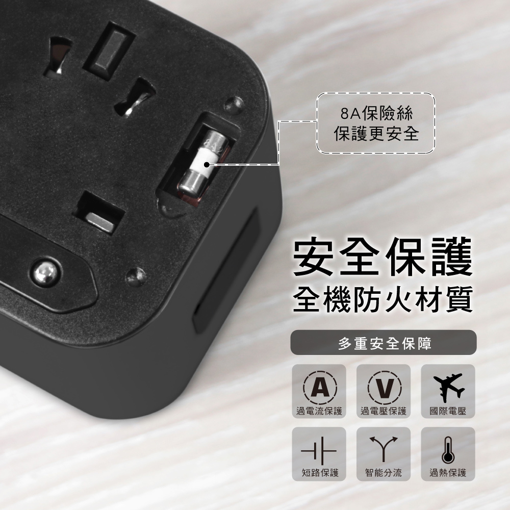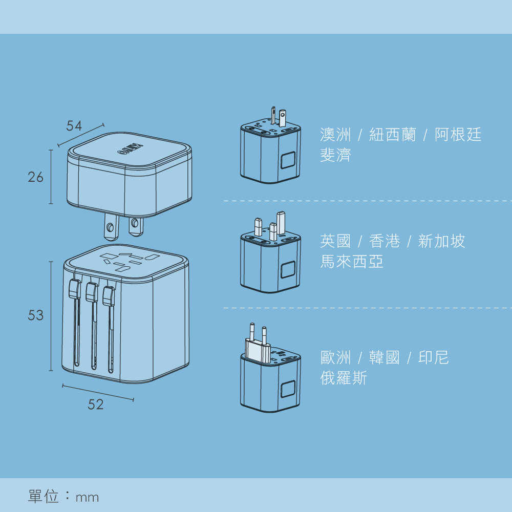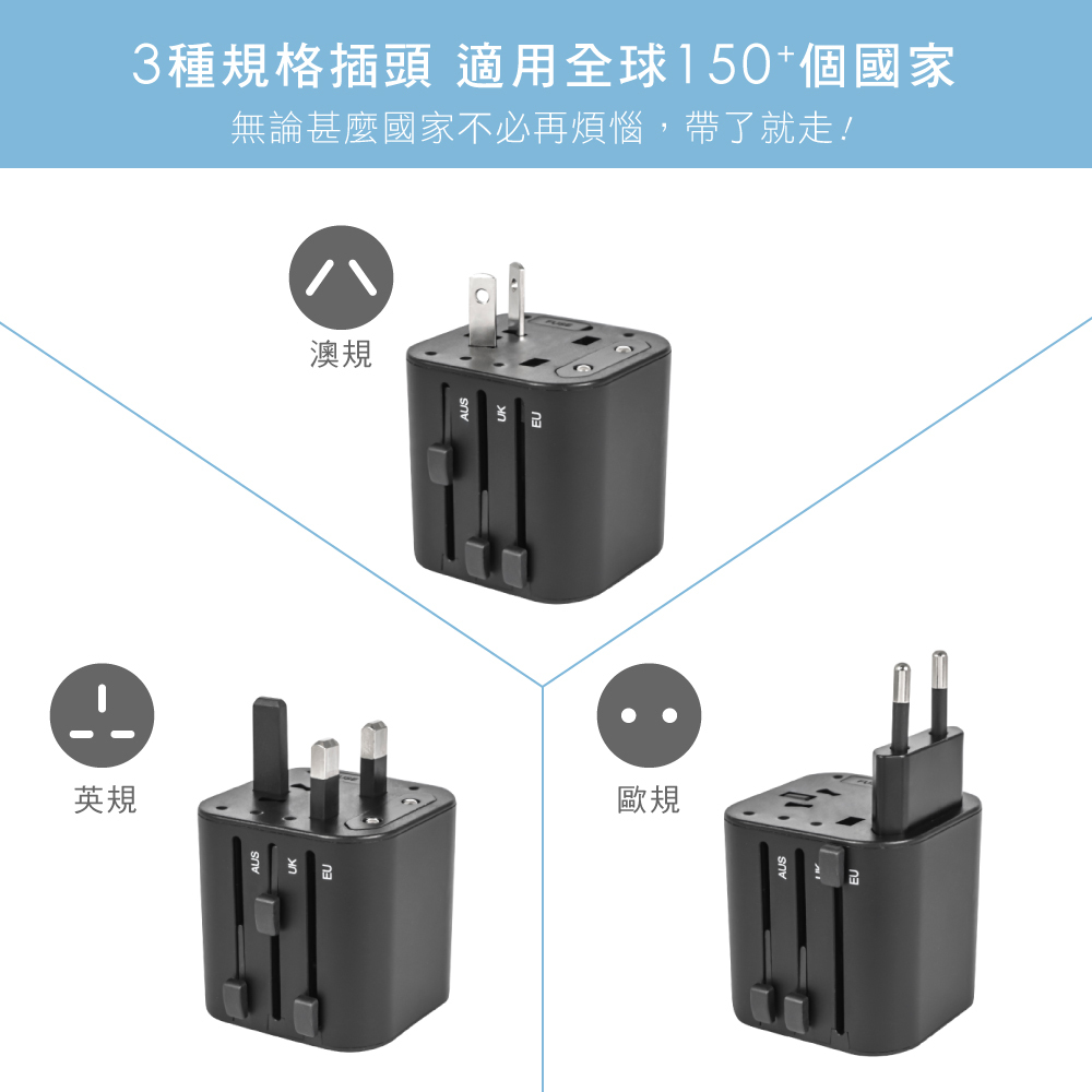3孔USB,三種多國插頭,多合一,外出旅行一顆就夠用。