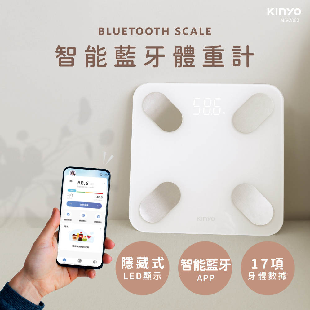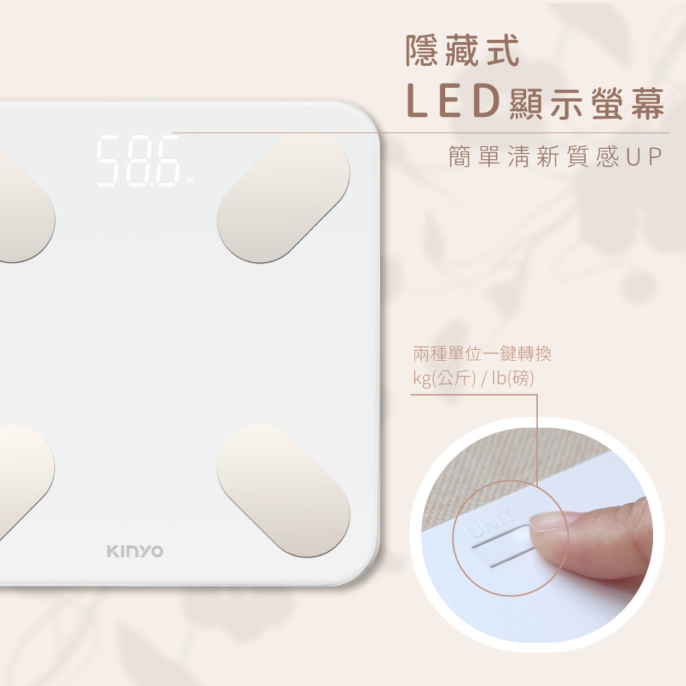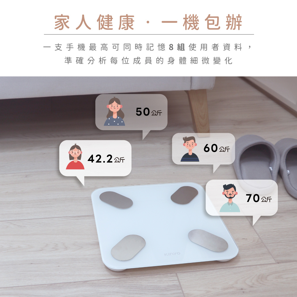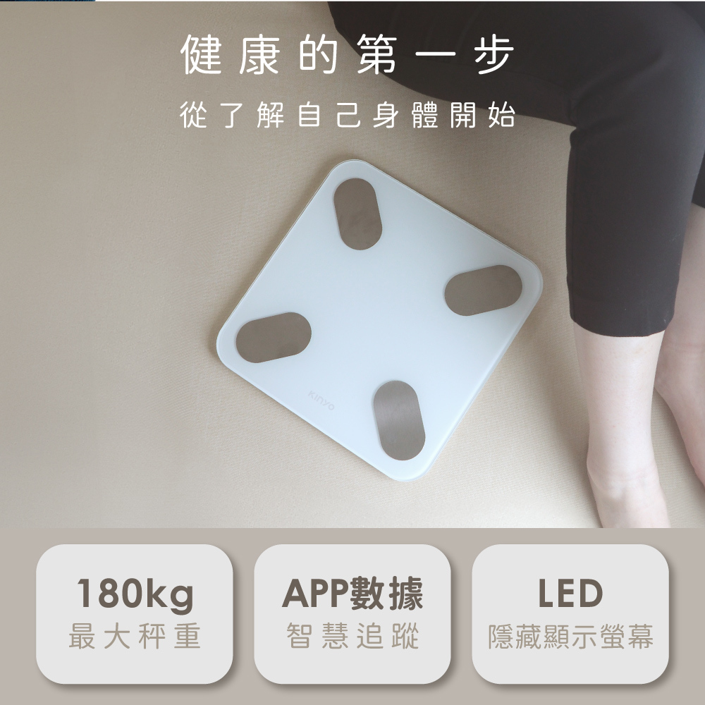 | 產品特色 | .智能藍牙App連結,高智慧的體重管理,掌控健康狀況。 .17項身體數據,分析身體狀態,輕鬆追蹤,守護健康。 .一支手機可同時儲存8位用戶資料。 .高精確度測重傳感器,低電量與超載提示功能,最大秤重‧ 180公斤。 .隱藏式LED顯示螢幕,簡單清新質感UP。 .簡約大方外觀,安全鋼化玻璃秤面,使用更安心。 .配置高精確度測重傳感器系統,重量鎖定便於查看秤量值。 .兩種單位轉換 kg(公斤) / lb(磅) .免開關,踏上即可秤重;貼心省電,離開後自動關機。 .底部防滑墊設計,安全穩固。 |