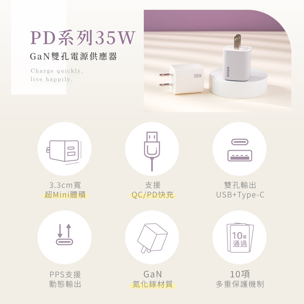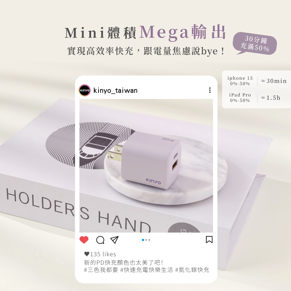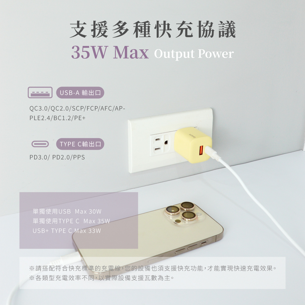 | 產品特色 | .氮化鎵(GaN)為新型半導體材質,超強導熱效率、極耐高溫 .急速快充,國際電壓高通用性 .PD3.0 USB-+ Type C 雙口輸出 .體積更小 體積-50% 【尺寸迷你攜帶好便利】 .重量更輕 50克羽量級 .效率更高 充電速度+300% 【手機半小時充滿50%電量】 .智慧涓流模式,安全保護裝置不過充 .多重保護,產品通過嚴格品質檢,充電更安全 .支援Macbook Pro、Switch、iPad、iPhone、Android 多樣設備皆通用 .多重保護裝置:過功率保護、輸出過電壓保護、過電流保護、降壓補償保護、短路過熱保護、智能電流匹配、自動截流保護、外殼阻燃材料、防塵灌封、減少靜電保護 |