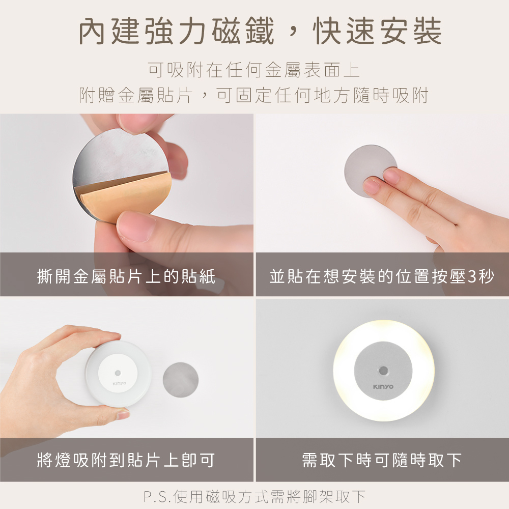 | 產品特色 | .暖黃冷白雙光源 溫和不刺眼,適應不同照明需求。 .無段式記憶亮度調整 依個人需求選擇合適照度。 .觸控三段色溫調整:白光/黃光/白黃雙光。 .USB線直充超方便 可移動照明,也可當壁燈使用。 .超長續航力 恆亮可用約4小時。 .機身內建強力磁鐵設計 可吸附在任何金屬表面上。 .附贈金屬貼片 可固定任何地方,隨時吸附。 .可拆卸式腳架設計 可桌立照明。" |