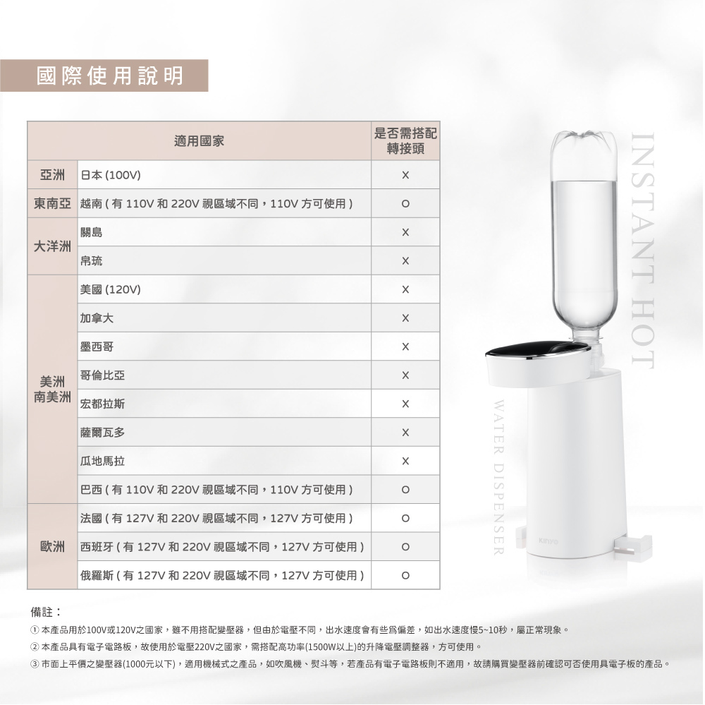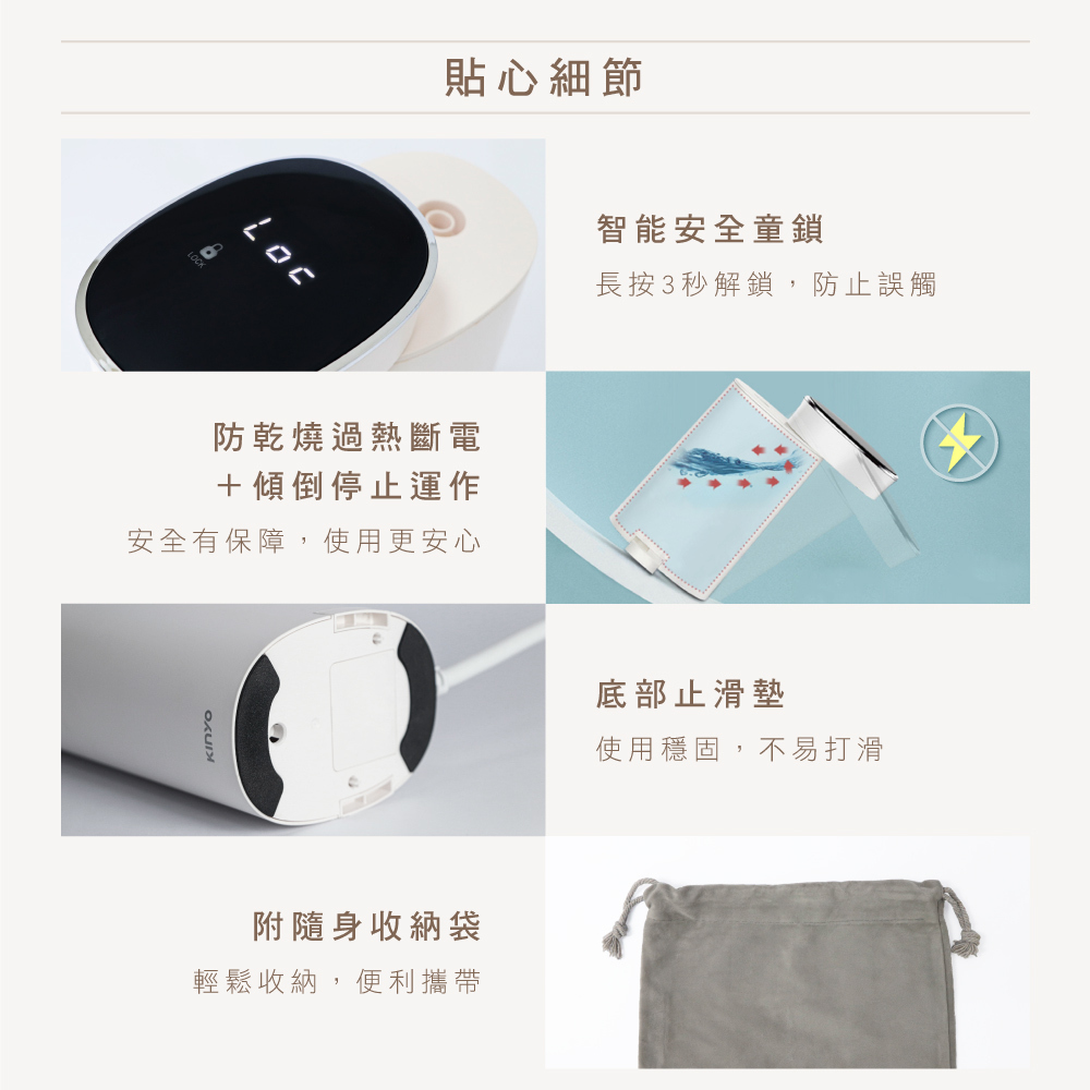 | 產品特色 | .插電即用,免安裝超方便 .LED觸控式面板,開關/童鎖/溫度一目了然 .搭載陶瓷加熱器,3秒瞬間加熱,飲用免等待 .常溫+4種常用溫度選擇(45度/60度/70度/98度) .智能安全童鎖,長按3秒解鎖,防止誤觸使用更安全 .傾倒停止運作功能,使用好安心 .防乾燒過熱斷電保護,安全有保障 .頂部旋轉式收合設計,方便收納不佔空間 .可收納彈跳支架,穩固機身不傾斜 .窄身設計,僅A5大小、超輕量850g .內附28mm/30mm兩種瓶口轉接頭,適用不同尺寸寶特瓶 .內附外接式水管(1M),輕鬆擴充、出水容量不設限 .上班外出、居家隨身、出國旅行,輕巧便攜 |