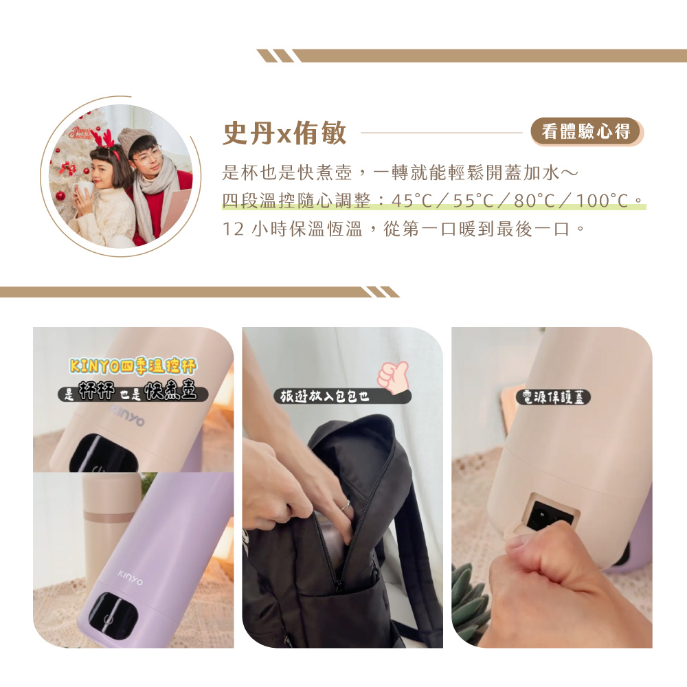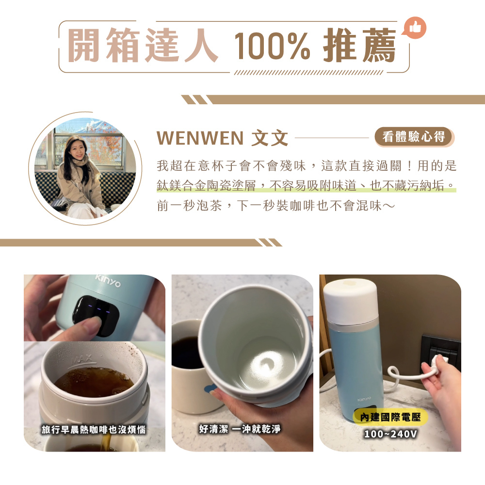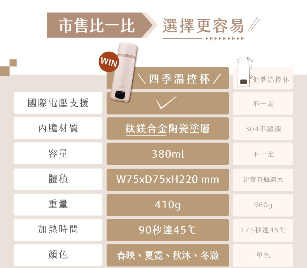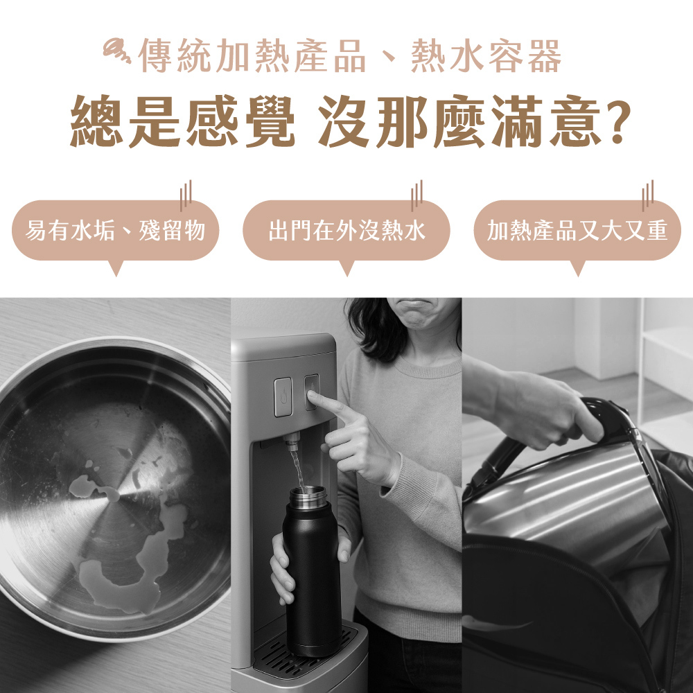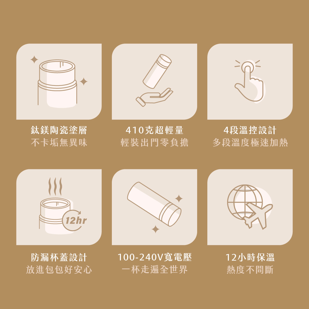 | 產品特色 | .4段溫控設定,45℃ / 55℃ / 80℃ / 100℃ .生水煮沸、冷水加溫,自由選擇控溫模式 .插電狀態12小時長效保溫,隨時滿足熱水需求 .LED螢幕顯示,溫度即時顯現 .觸控式螢幕面板,簡單好上手 .鈦鎂合金陶瓷塗層不沾黏無異味,照顧飲水品質與健康 .380mL獨享容量,6分鐘快速加熱沸騰 底部防滑矽膠墊,安全穩固 |
