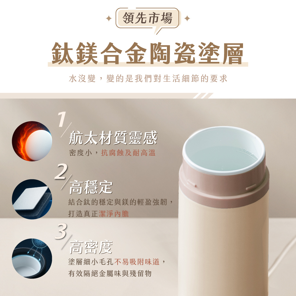 鈦鎂合金陶瓷塗層不沾黏無異味,照顧飲水品質與健康