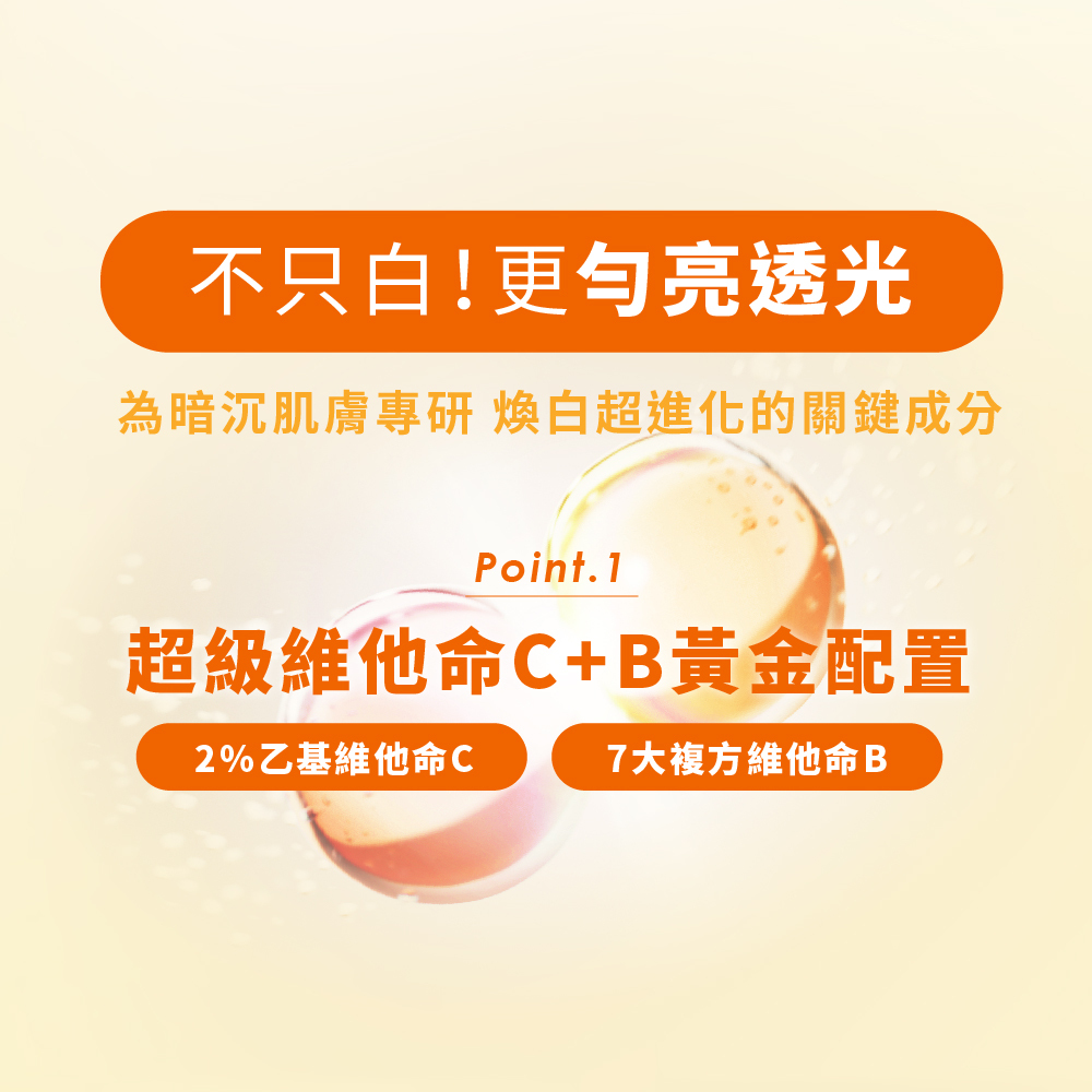 ●為暗沉肌膚專研,超級維他命C+B黃金配置,不只白!更勻亮透光!