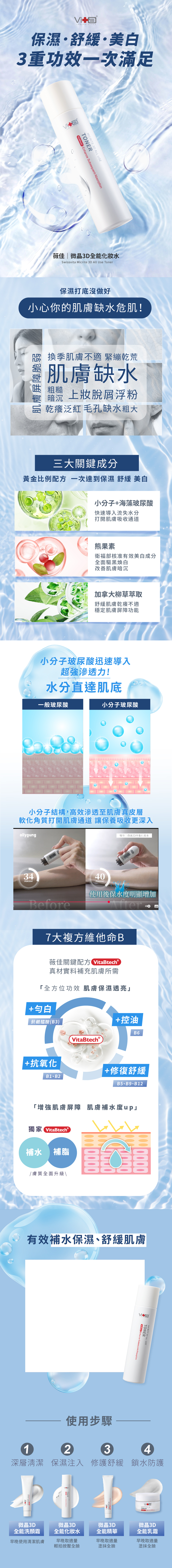 | 產品特色 | 毛孔深度清潔,保濕不乾澀。添加深海微生物多醣配方,舒緩肌膚不適,富含30%胺基酸的超晶透泡泡,深層清潔毛孔髒污,辣木籽萃取物維持肌膚油水平衡,保濕水潤一整天。升級版添加獨創維穩成分VitaBtech,精選多種維他命B,給予肌膚最需要的功能,維持在健康狀態,舒緩不適感,修護加倍。 【全方位修復,對抗肌膚水逆,維持健康力】所有肌膚問題源於肌膚屏障變弱,奇蹟維他命B12、貓爪藤萃取與VitaBtech三大黃金成分,為肌膚做好關鍵修護,給後續保養神救援 3重功效導入 保濕.美白.舒緩。開啟肌膚柔軟水嫩的三大秘訣,先軟化肌膚,導入小分子與海藻玻尿酸,補充肌膚流失水分;注入美白成分-熊果素,由內而外散發淨白光采;加拿大柳草萃取與VitaBtech讓肌膚舒緩加倍,打造健康肌質。同時擁有保濕、美白、舒緩功效的全能化妝水。 平衡油脂、打擊乾燥、撫平細紋,一瓶解決多重肌膚問題。修護滋養,鎖住肌膚保養,提高保養功效。 |