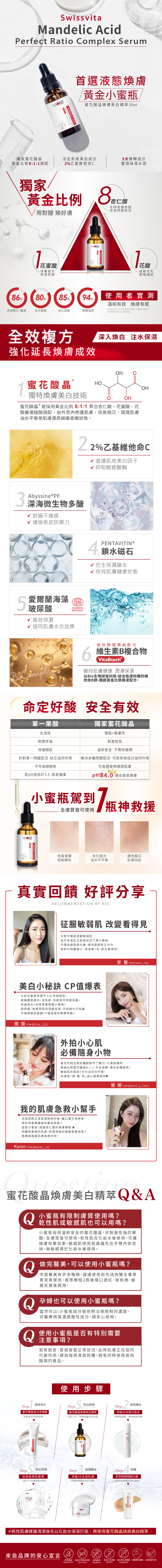 | 產品特色 | 【小蜜瓶還你細白嬰兒肌】蜜花酸晶™黃金比例。 8:1:1 聚合杏仁酸、花蜜酸、花酸,獨家黃金比例,有效減少老廢角質囤積,深海微生物多醣同時舒緩肌膚不適,還你細白嬰兒肌。 |