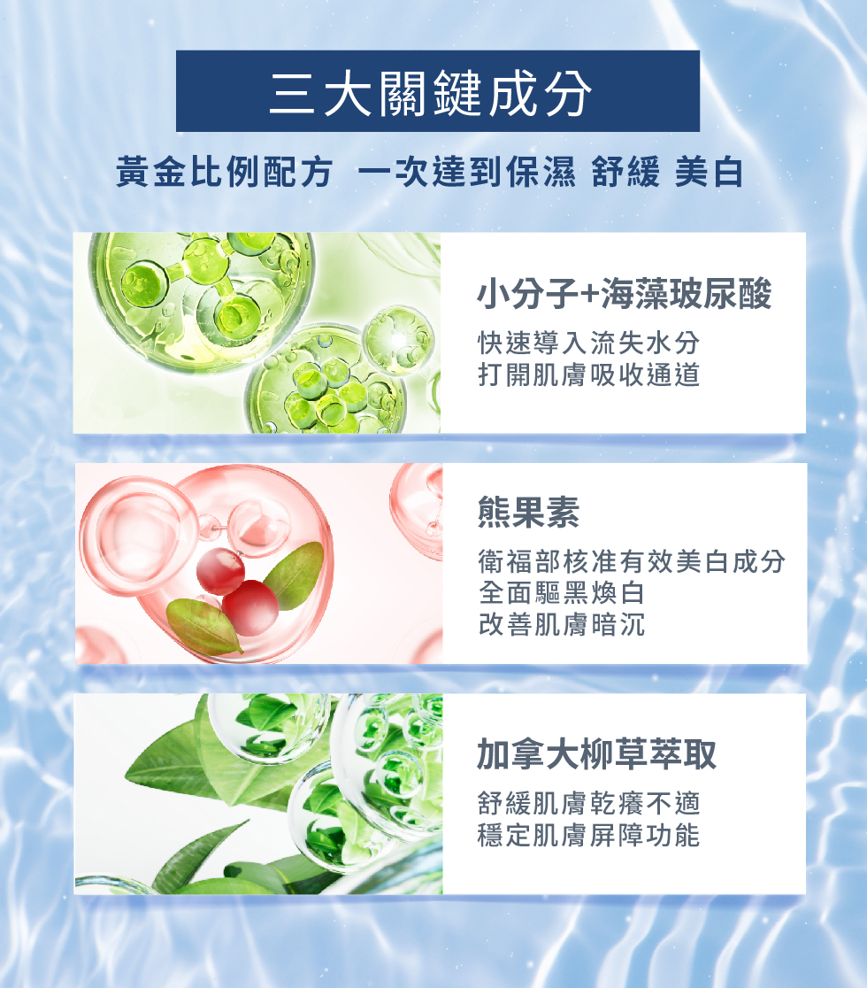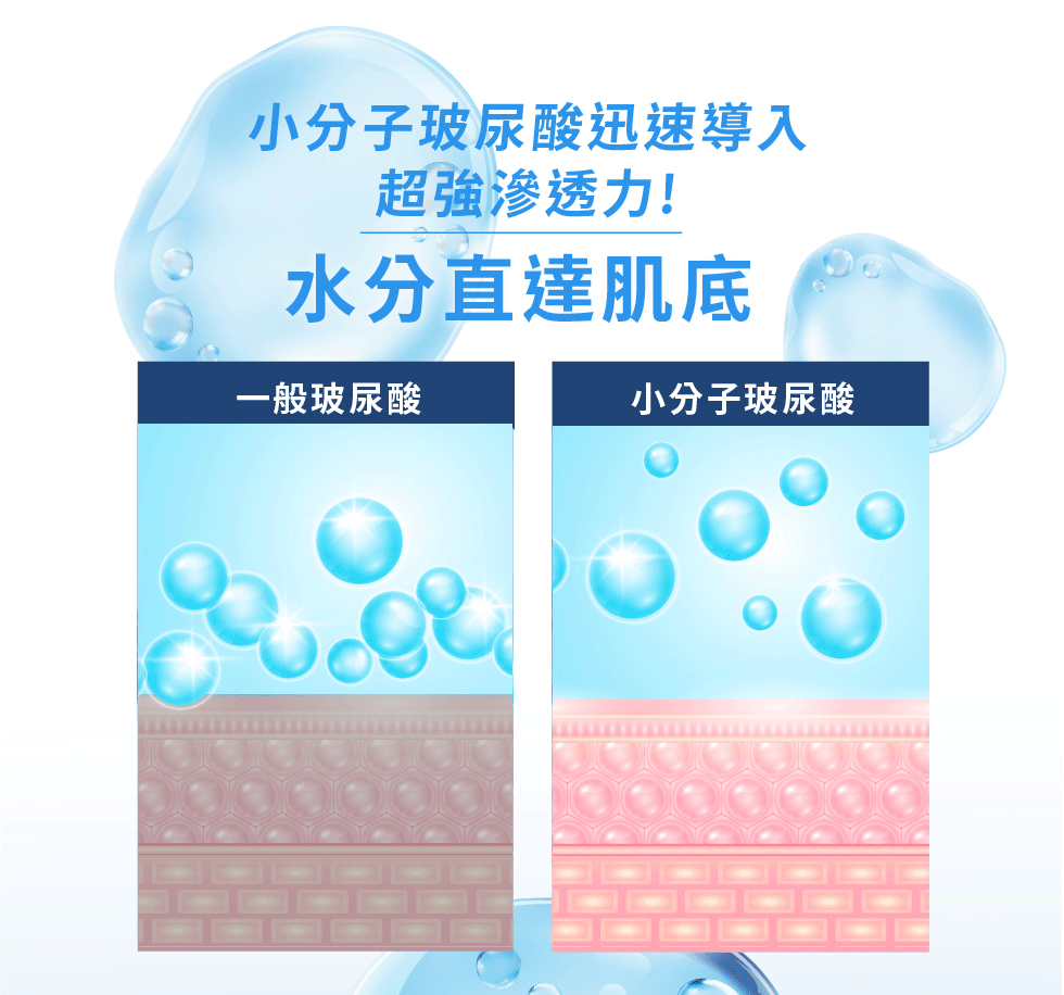 ●導入小分子與海藻玻尿酸,補充肌膚流失水分
